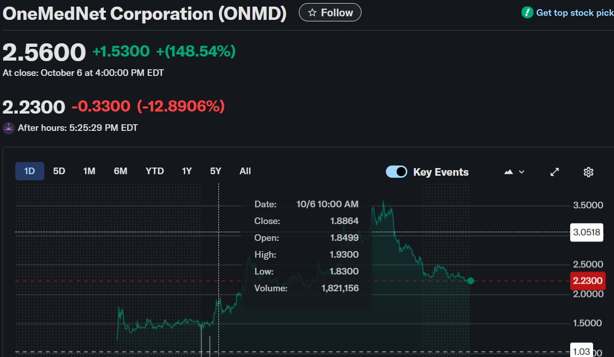 OneMedNet Corporation(ONMD) surged 148.54% during trading on October 6, closing at $2.56 after a sharp rally that peaked above $3. However, the stock dropped 12.89% in after-hours trading to $2.23.