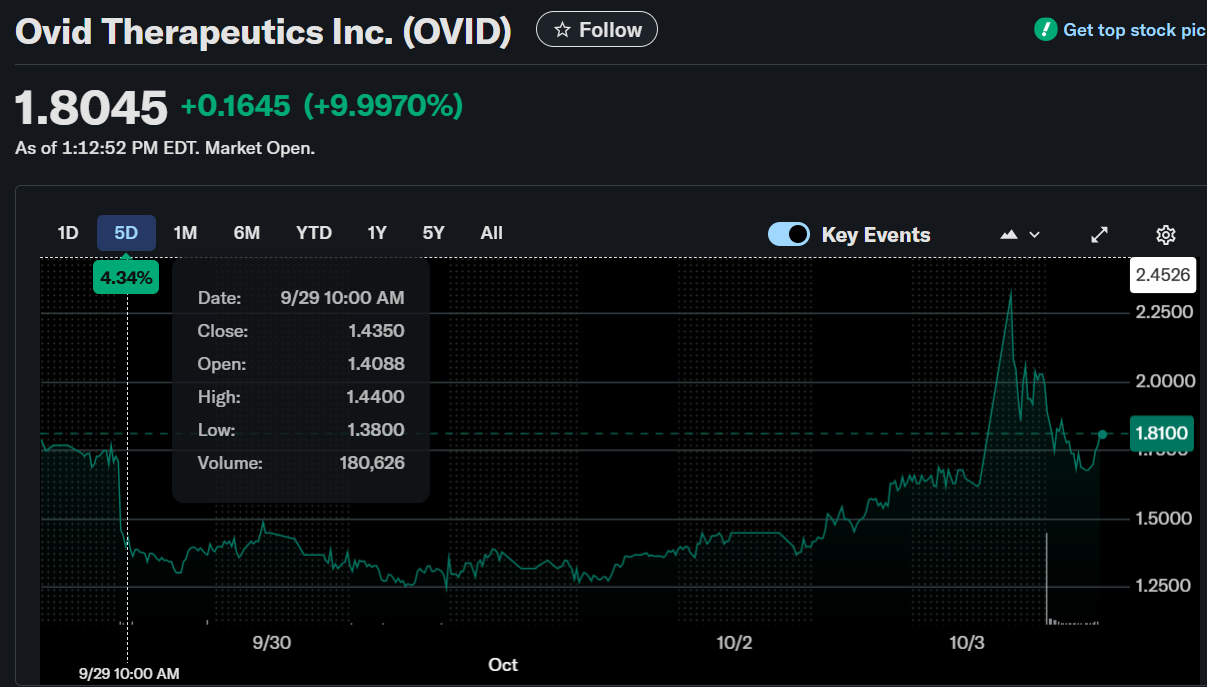 Ovid Therapeutics(OVID) stock rallied sharply after the company announced a $175 million private placement deal. The stock closed at $1.64, marking a 19.71% surge, and extended gains in pre-market trading. Momentum continued as shares reached $2.04, reflecting strong buying interest and positive sentiment.