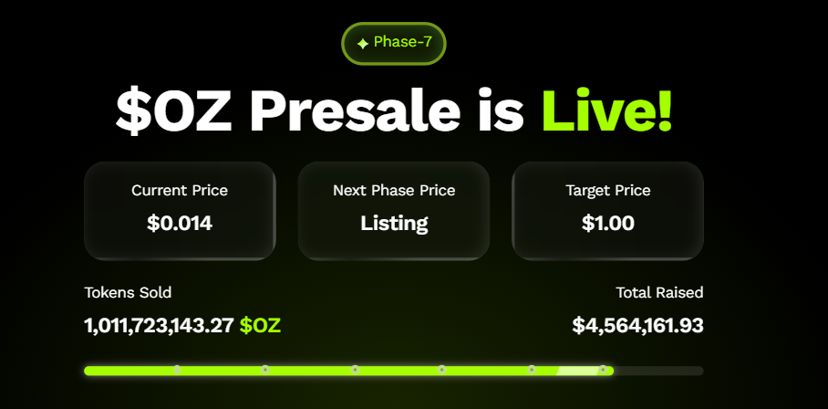 Presently, Ozak AI is trading at $0.014 as its final Phase of presale is underway. To date, from the start of the presale journey, it has collected over $4.8 million and sold over 1 billion $OZ tokens.