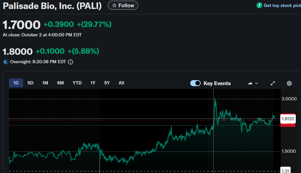 Palisade Bio, Inc. (Nasdaq: PALI) closed the regular session with a gain of nearly 30%, ending at $1.70 per share. The rally extended into after-hours trading, pushing the stock up another 6% to $1.80.