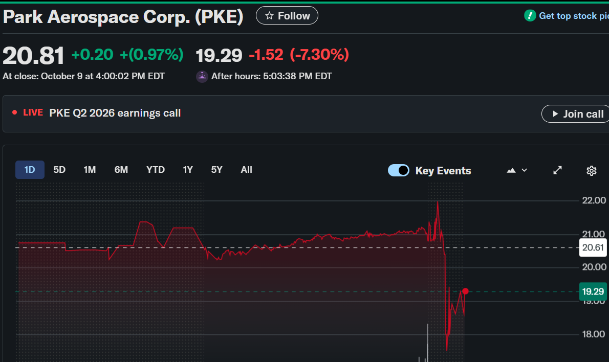 Park Aerospace Corp. ended the day strong but saw a sharp after-hours drop following its fiscal Q2 2026 results. The company’s stock closed at $20.81, up 0.97%, before falling 7.30% to $19.29 after releasing earnings.