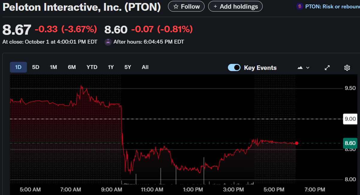 Peloton shares slipped sharply during Thursday’s session despite the company unveiling a sweeping overhaul of its product portfolio. The stock fell from above $9.00 in early trading to near $8.20 before recovering slightly. It closed at $8.67, down 3.67%, and eased further to $8.60 after hours.