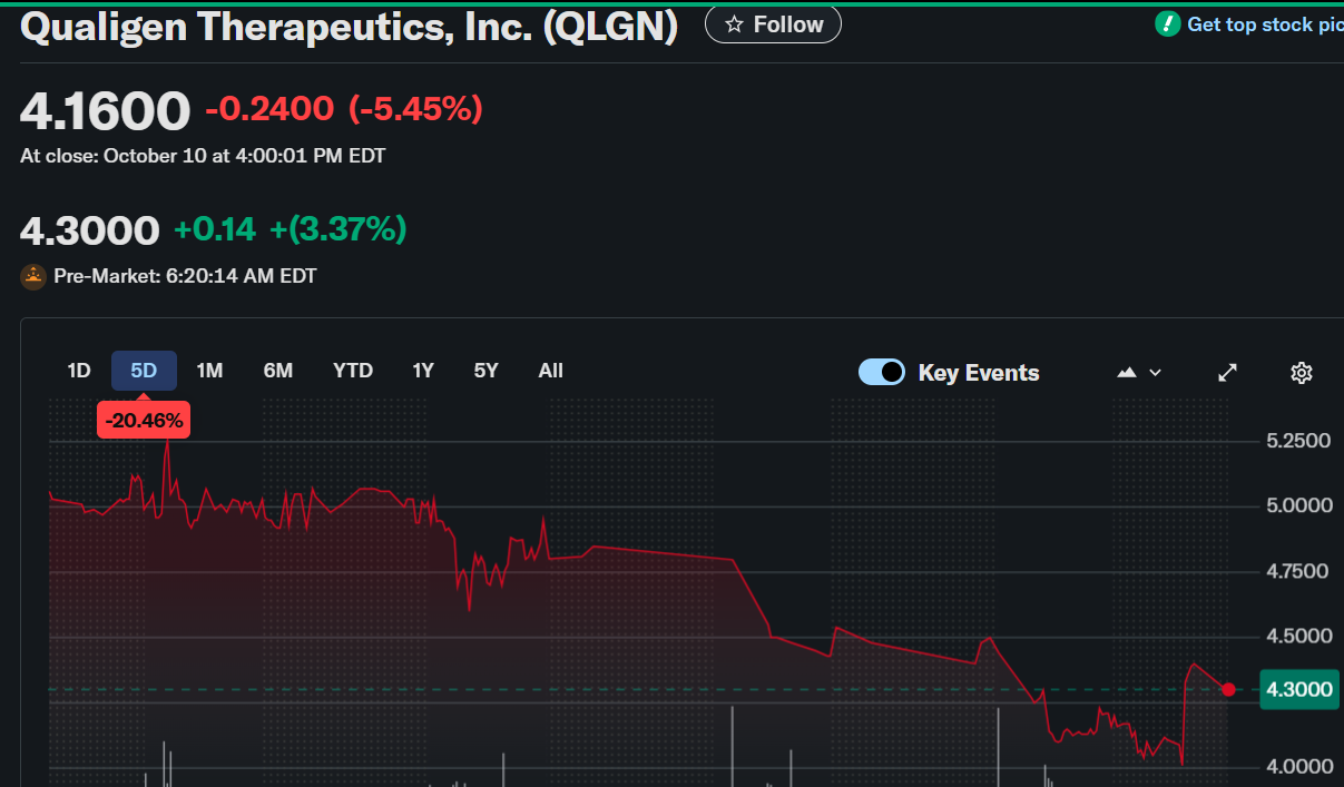 QLGN gained attention after announcing the launch of its C10 Cryptocurrency Asset Treasury (DAT). The stock closed at $4.16, down 5.45%, yet its pre-market rebound to $4.40 reflected renewed strength. QLGN remains positioned for potential growth as CXC10 advances its strategic digital asset initiative.