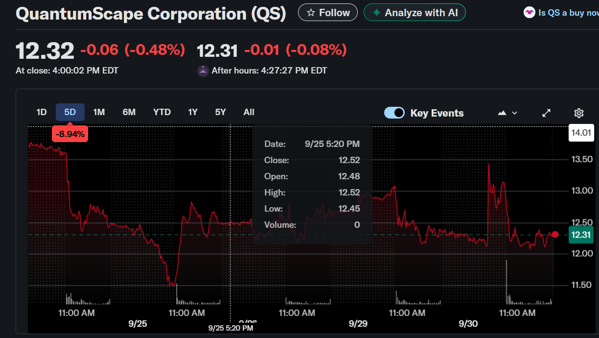 QuantumScape Corporation (QS) stock closed at $12.38, marking a decline of 2.21%, but pre-market trading quickly reversed the trend. The pre-market price rose 3.19% to $12.77, showing strong interest from market participants after a volatile session. Intraday trading recorded a low of $12.17 and a high of $12.89, confirming active reactions around key technical levels.