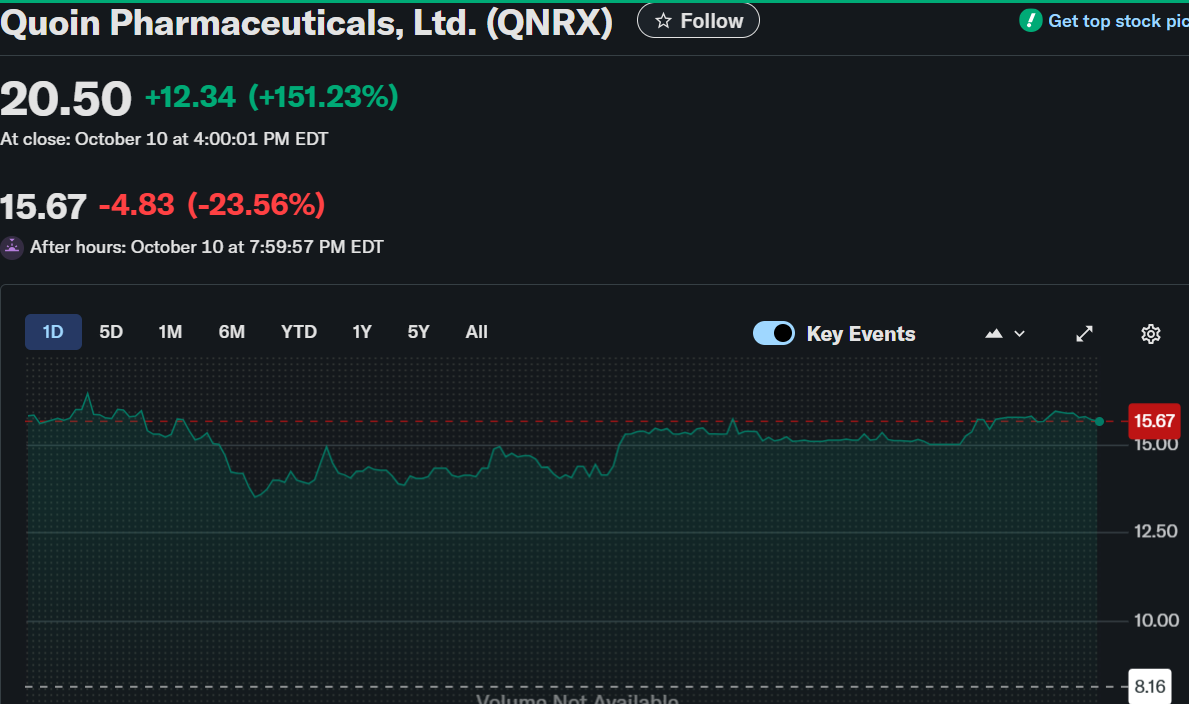 QNRX stock surged 151% during regular trading, closing at $20.50 after reaching a $40 peak intraday. The spike followed an announced $104.5 million private placement, which came at a premium to the prior closing price. However, QNRX fell sharply in after-hours, dropping 24% to $15.67, reflecting high volatility.