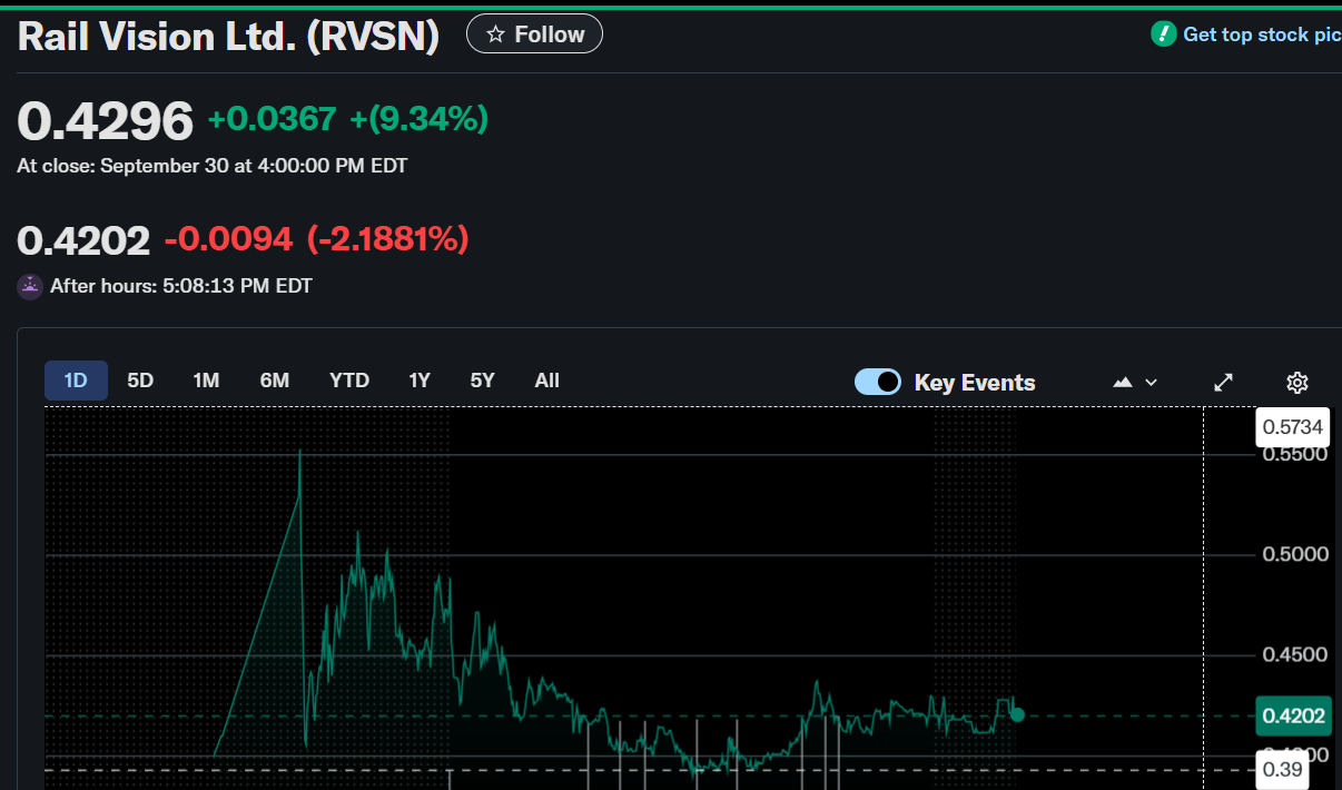 Rail Vision Ltd.( RVSN) experienced strong trading activity following the announcement of a planned acquisition of Quantum Transportation Ltd. The stock closed with a 9.34% gain at $0.4296 before easing slightly in after-hours trading.