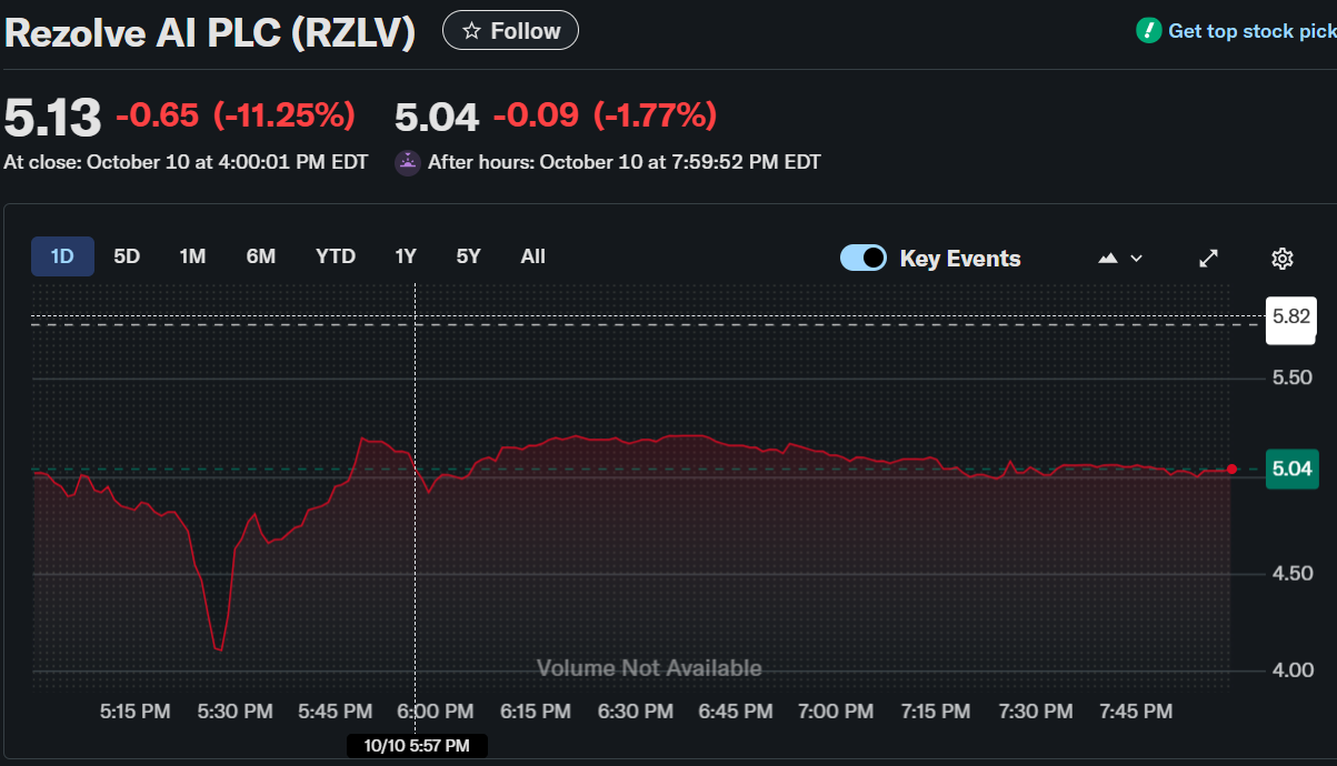 RZLV fell hard during Friday’s session and then softened further after-hours. The stock closed at $5.13 and later hovered near $5.04. This is a weak finish, but trading remained orderly and transparent.