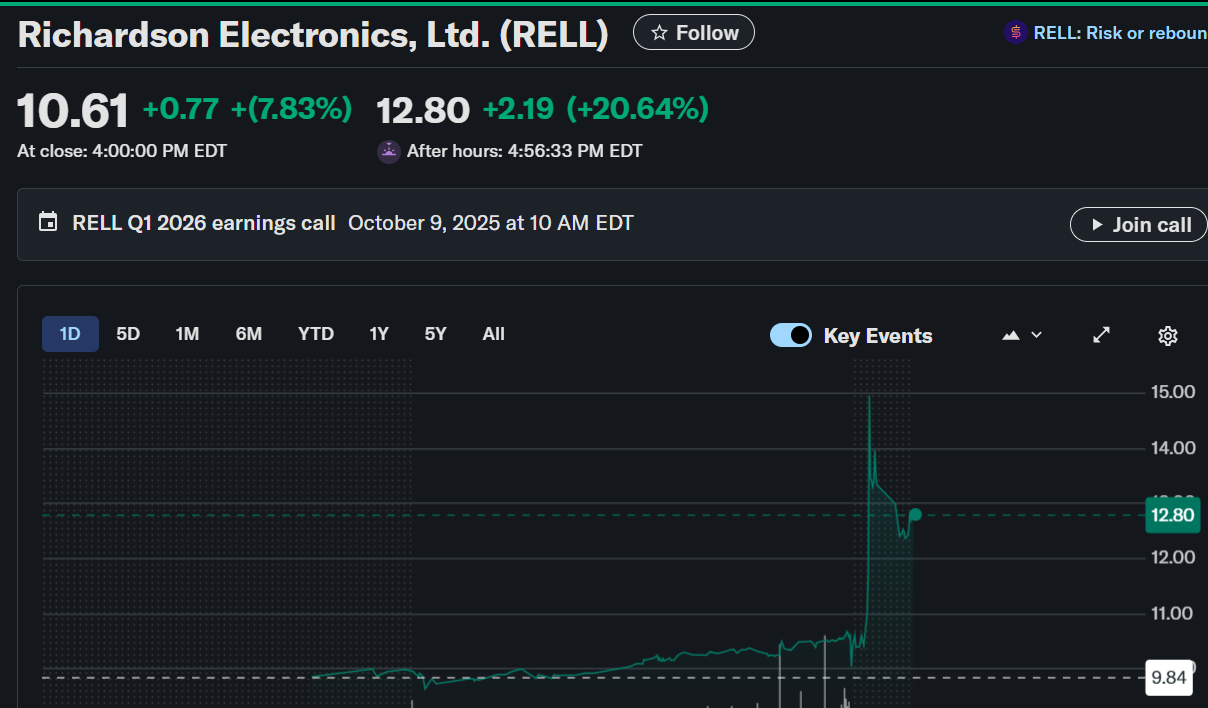Richardson Electronics (RELL) stock closed at $10.61, rising 7.83% on the day, then surged another 20.64% after hours to $12.80.