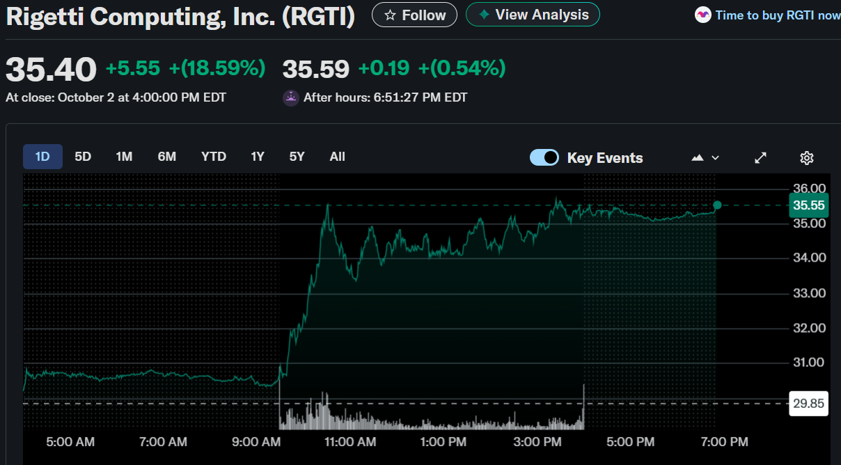 Rigetti Computing’s stock closed at $35.40 after jumping 18.59% during Thursday’s session. It added another 0.54% in after-hours, reaching $35.59.