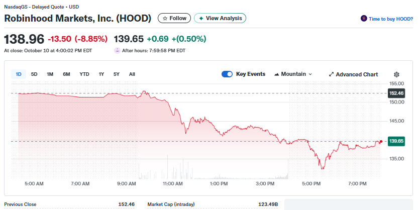Robinhood Markets (NASDAQ: HOOD) saw its stock dip nearly 9% on October 10, closing at around $139 after a turbulent trading week.