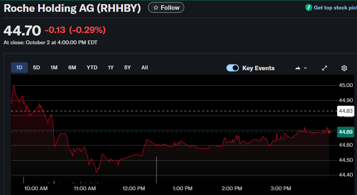 RHHBY performance reflected cautious trading despite the positive regulatory development. Shares stabilized in the $44.50–$44.75 range after morning volatility. The limited rebound suggested muted near-term momentum.