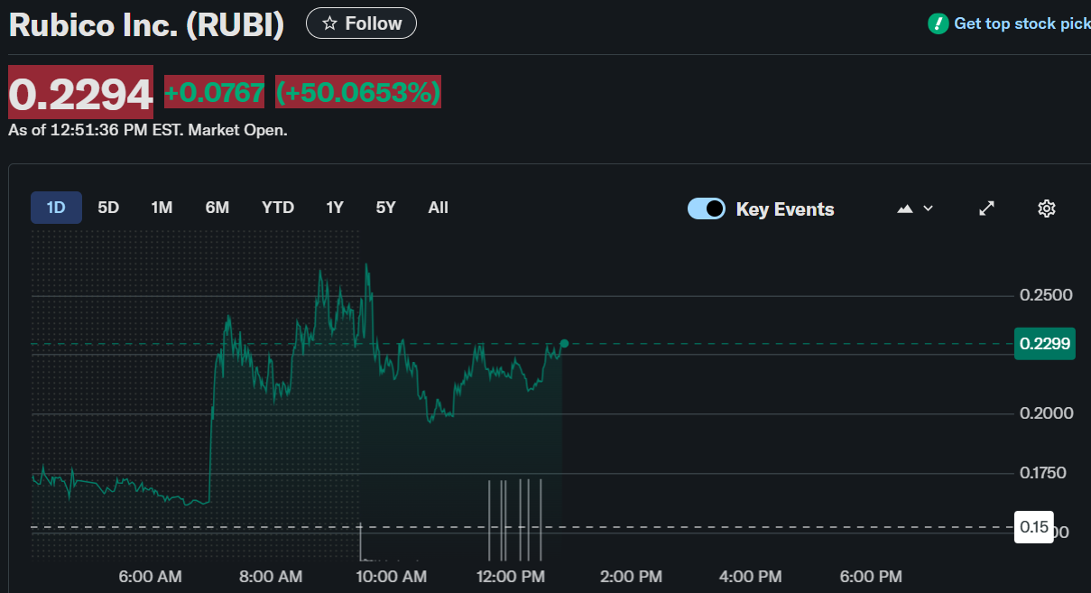 Rubico Inc. (RUBI) has experienced a significant surge in its stock price, rising by 41.09% to $0.2154.