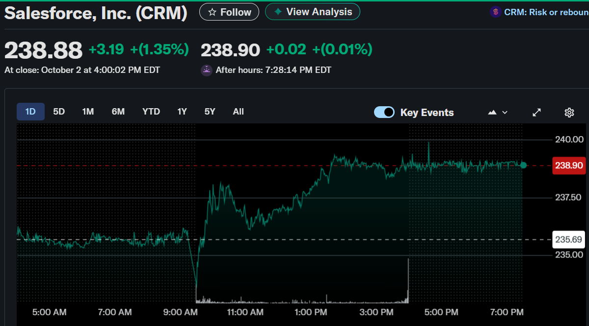 Salesforce stock closed at $238.88, rising 1.35% during Thursday’s session. The stock maintained stability in after-hours trading, showing a slight uptick to $238.90. This performance followed a volatile open but a strong rally during mid-morning trading.