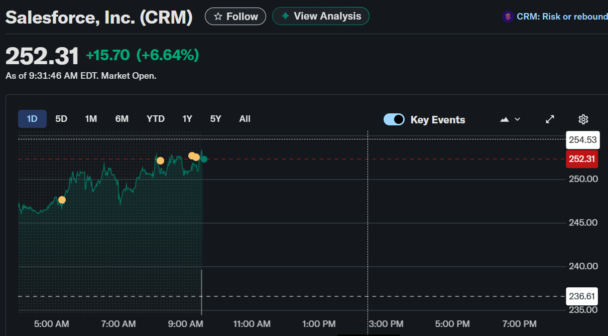 CRM surged in pre-market trading after setting a bold new long-term revenue target of over $60 billion by fiscal 2030. Salesforce Inc. (CRM) stock surged 6.64% to $252.31 as of 9:31 AM EDT, showing a strong upward trend in early trading following a steady climb from premarket hours.. This renewed momentum reflected growing confidence in Salesforce’s ability to scale its AI-driven business and achieve sustained growth.