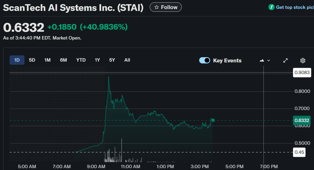 ScanTech AI Systems Inc. (Nasdaq: STAI) experienced a sharp stock surge of over 40% following market open on Thursday. The price briefly peaked before dipping midday and later stabilized at $0.6332 by the afternoon.