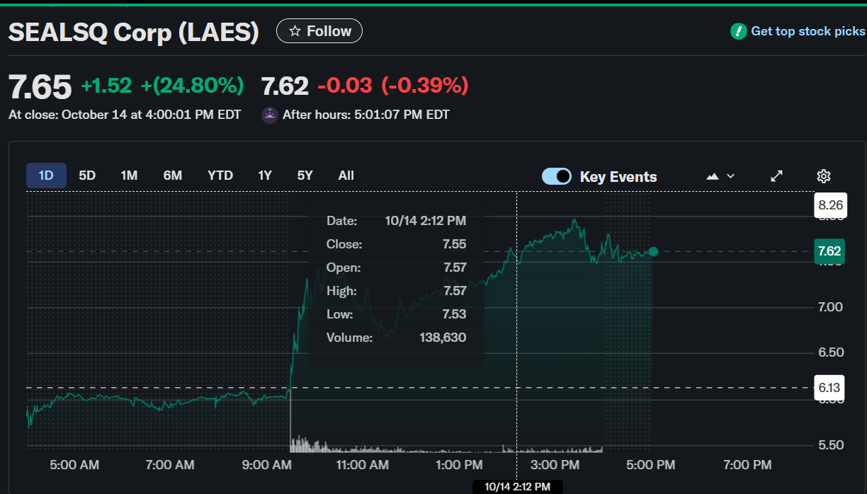 SEALSQ Corp surged 24.8% on October 14, closing at $7.65 after announcing a new post-quantum KYC collaboration.