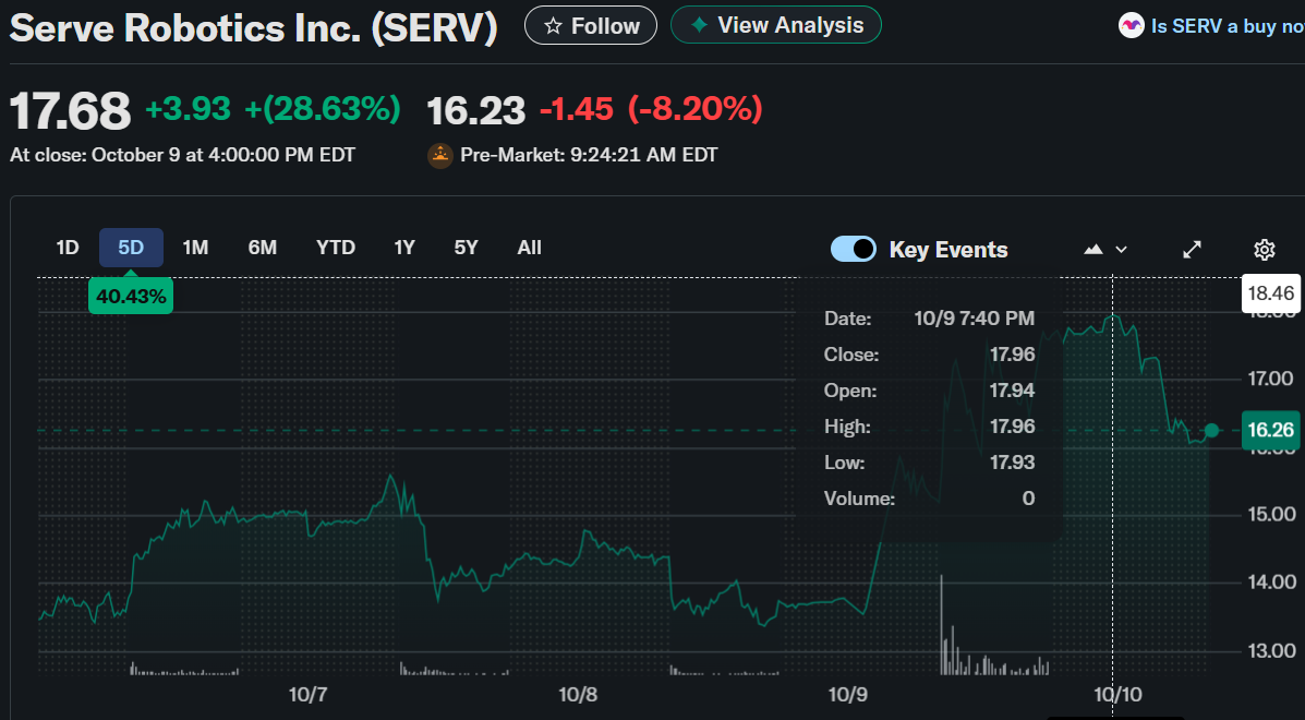 Serve Robotics Inc. (SERV) experienced a sharp surge in market activity, with its stock closing at $17.68, representing a strong 28.63% gain. The surge followed the company’s announcement of a $100 million registered direct offering aimed at strengthening its financial position. However, the pre-market session reflected a pullback as shares fell to $16.30, showing a decline of 7.81%.