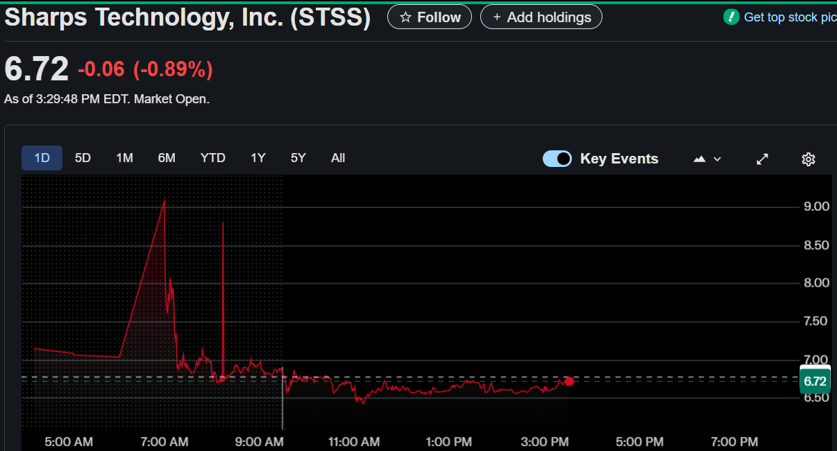 Sharps Technology, Inc. (STSS) shares experienced high morning volatility, as they surged above $9 before retreating to close at $6.72. Despite this downward shift, the stock closed only slightly down by 0.89%, showing some support near the $6.70 level.