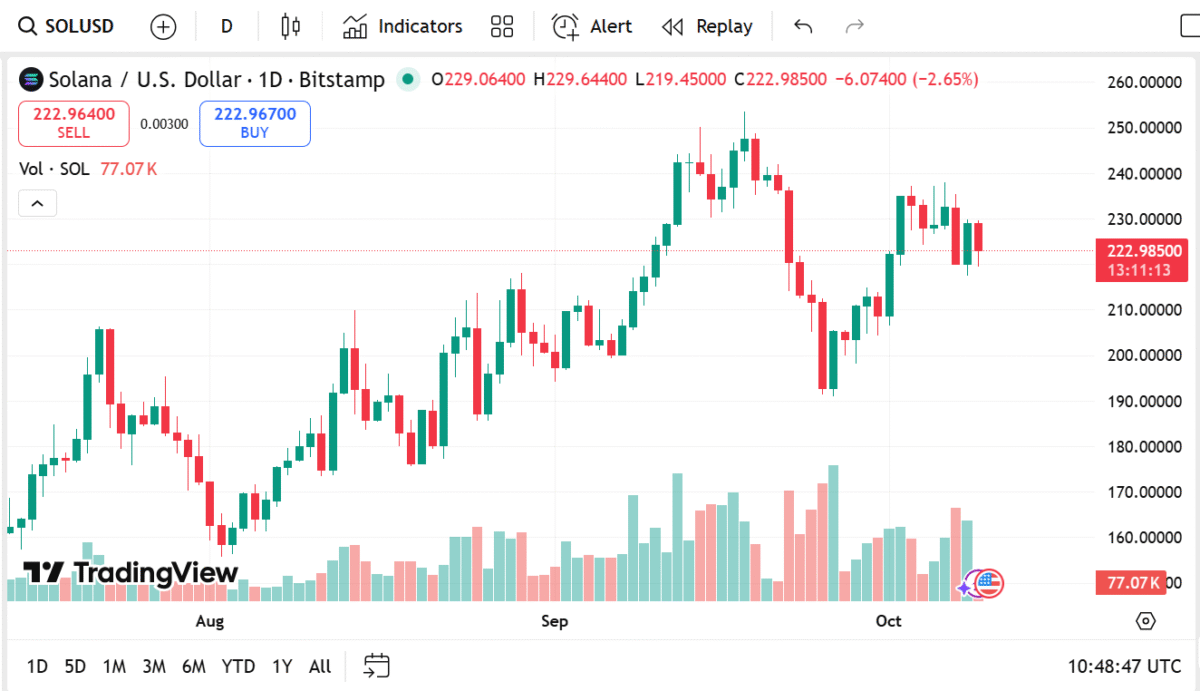 Solana is currently selling at $222.96 after losing 0.79% over the last 24 hours. The network’s market cap stands at $120.65 billion with a daily trading volume of $7.54 billion, a 16.39% decrease from yesterday. Solana’s robust network allows low-cost transactions, and users and developers are attracted to it.