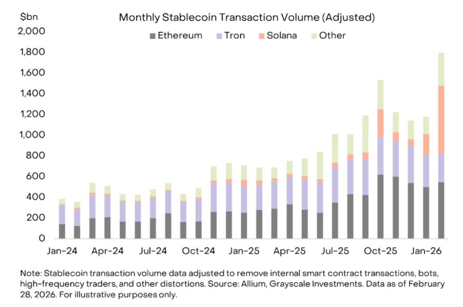 Beyond price movements, Solana’s blockchain infrastructure processed an unprecedented $650 billion in stablecoin transfers throughout February 2026, per research published by Grayscale Investments.