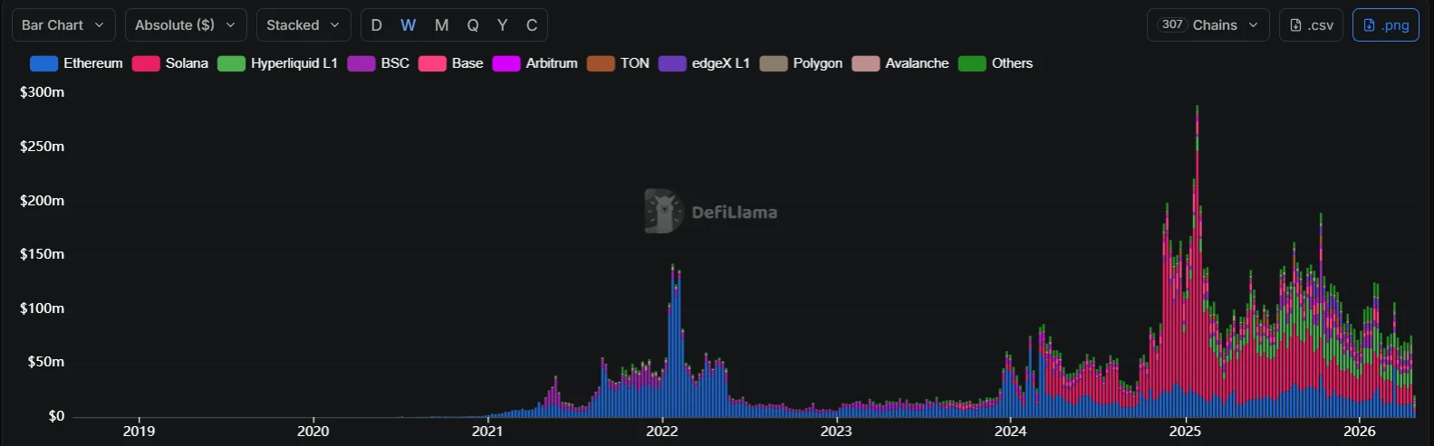 Hyperliquid L1 secured second position with $14.18 million, while Ethereum claimed third place at $13.55 million. Other networks trailed significantly: Polygon generated $7.58 million, Base produced $4.28 million, BNB Chain recorded $4.15 million, Arbitrum posted $1.62 million, and TON brought in $1.37 million.