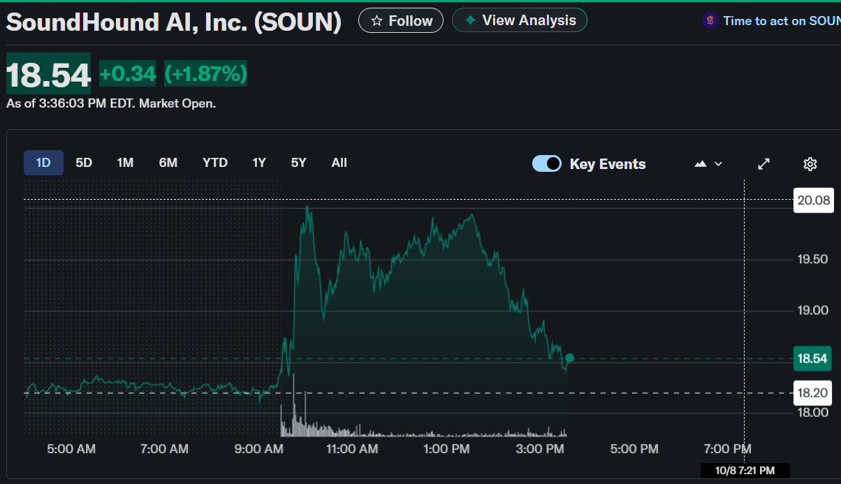 SoundHound AI, Inc. (SOUN) advanced 1.87% to close at $18.54 on October 8, 2025. The stock briefly touched $20.08 during a sharp mid-morning rally.