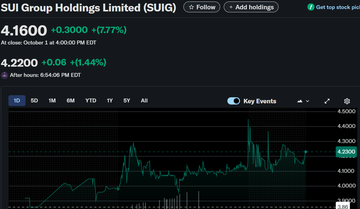 SUI Group Holdings Limited closed at $4.16 after gaining 7.77% and advanced further to $4.22 in after-hours trading.
