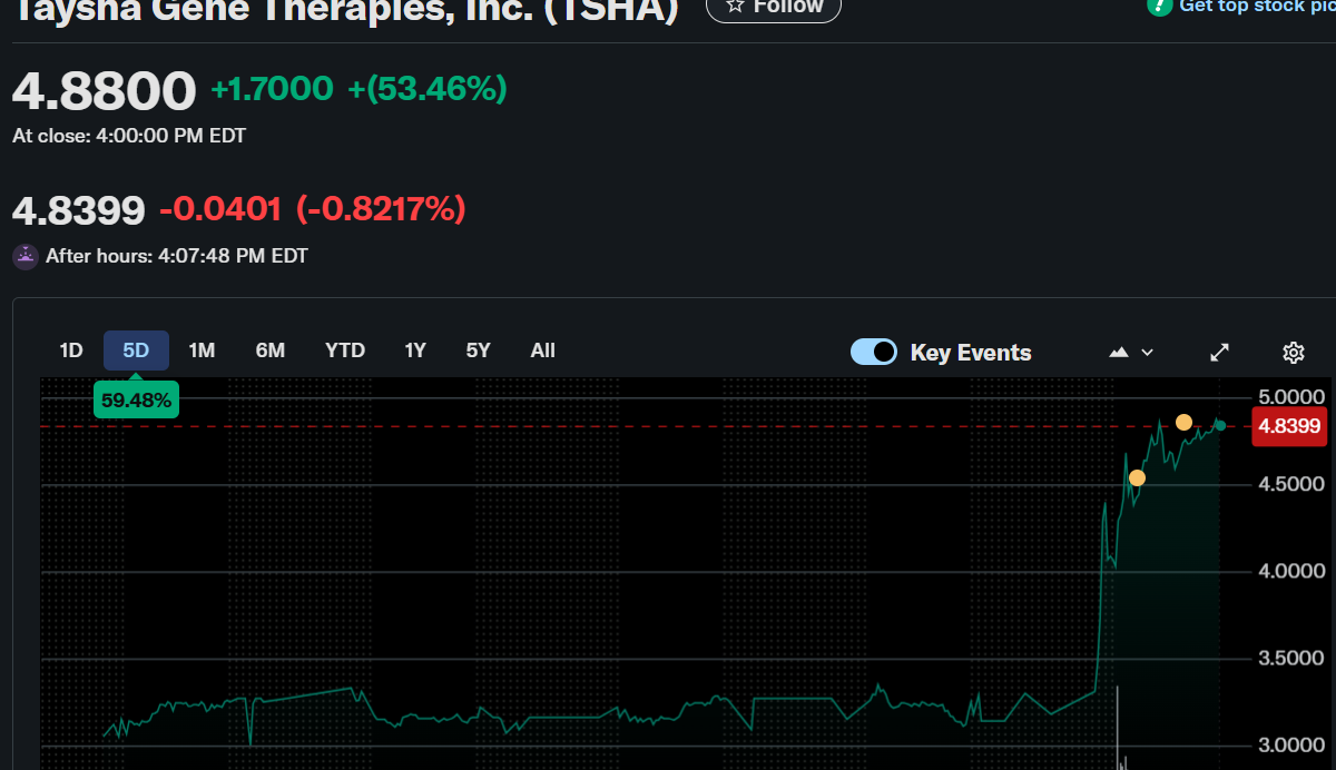 TSHA stock surged 52% to $4.84 following significant regulatory progress. The U.S. Food and Drug Administration granted Breakthrough Therapy designation to TSHA-102, an investigational gene therapy for Rett syndrome. The designation reflected compelling data from the REVEAL Phase 1/2 trials.