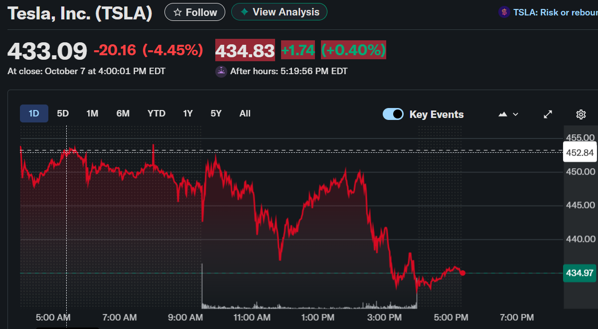 Tesla shares closed at $433.09 on Tuesday, marking a 4.45% decline during regular trading. After the market closed, the stock slightly recovered in after-hours trading, rising by 0.40% to $434.83.