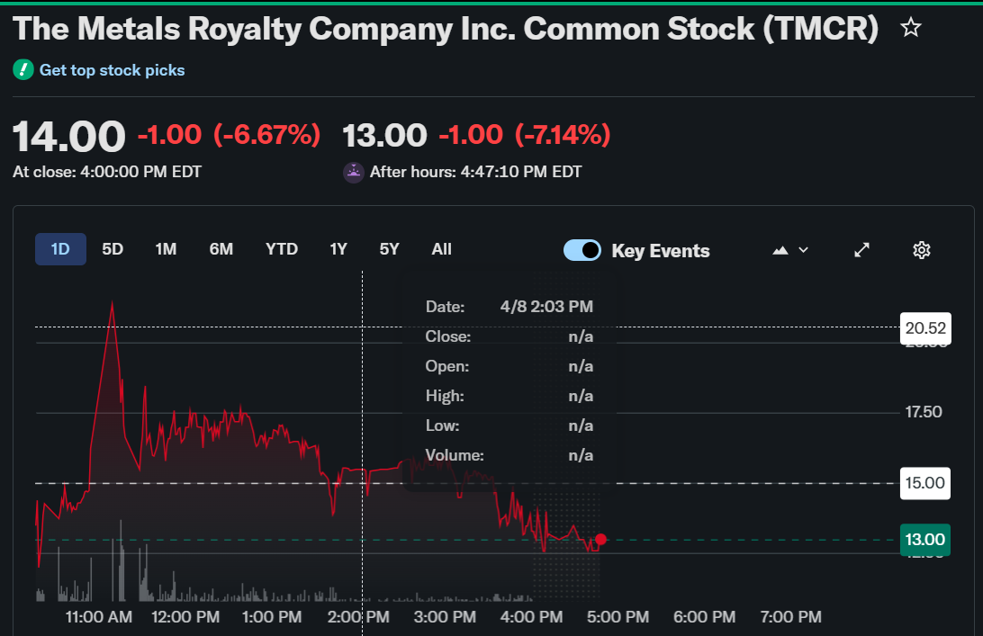 The Metals Royalty Company Inc. (TMCR) recorded a weak Nasdaq debut as shares declined sharply on the first trading day. The stock closed at $14.00, down 6.67%, and extended losses after hours to $13.00, falling another 7.14%. The early decline reflected bearish sentiment despite the company’s strategic focus on critical minerals.