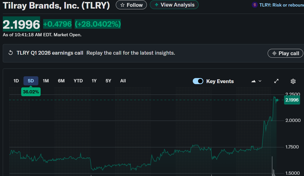 TLRY stock surged 27.86% to $2.19 following the release of its Q1 2026 earnings report.