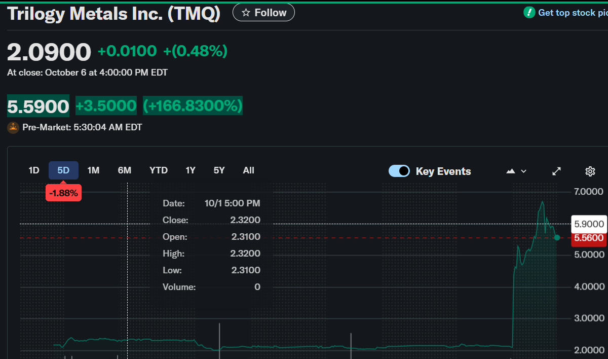 Trilogy Metals Inc.(TMQ) stock surged 193% in pre-market trading to $6.14 after closing at $2.09. The sharp rise followed confirmation that the U.S. Department of War will invest $35.6 million in the company. The agreement signals a major step toward advancing critical mineral projects in Alaska.