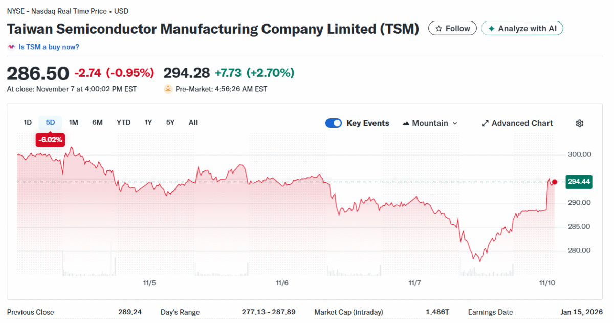 The stock, listed on the NYSE under ticker symbol TSM, closed at $286.50, down 0.95% in the previous session, before rebounding 2.63% in pre-market trading Monday to $294.08.