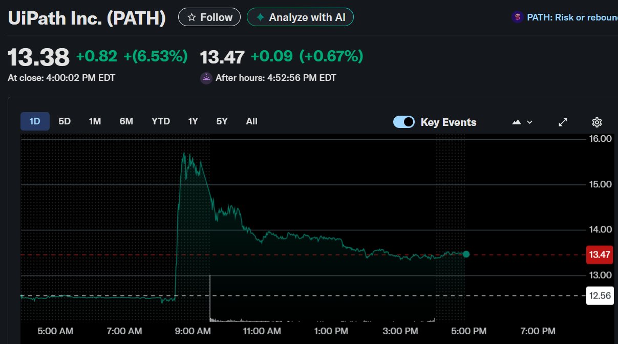 UiPath(PATH) stock surged more than 10% by midday, reaching $13.89 after a sharp rally that lifted shares from early lows. The strong move reflected heightened market attention on the company’s latest strategic collaboration with OpenAI. The announcement positioned UiPath at the center of accelerating enterprise automation and advanced AI adoption.