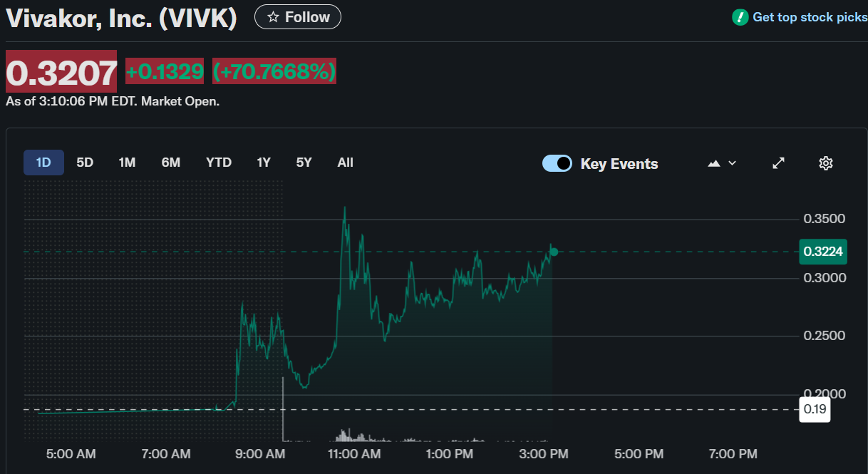 VIVK Stock surged 57.78% to $0.2962 after announcing plans for a $40 million commodity intermediation credit facility.