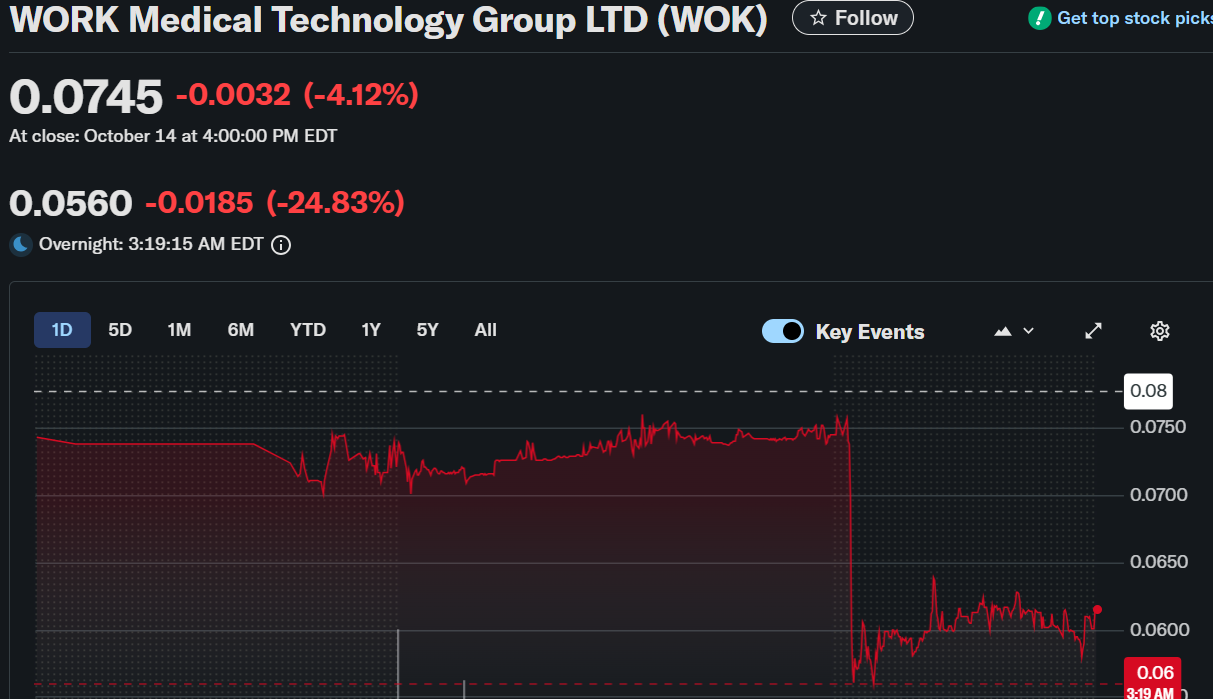 WORK Medical Technology Group Ltd (NASDAQ: WOK) saw a sharp drop in its stock value on October 14, 2025. Shares closed at $0.0745, marking a 4.12% daily loss, and extended losses overnight by 24.83% to $0.0560.