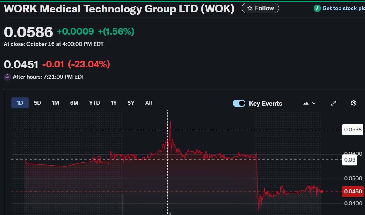WORK Medical Technology Group LTD experienced a sharp shift in its stock performance on October 17, 2025. The stock gained 1.56% in regular trading, closing at $0.0586. After-hours trading brought a 23.04% plunge, pushing the stock down to $0.0451.