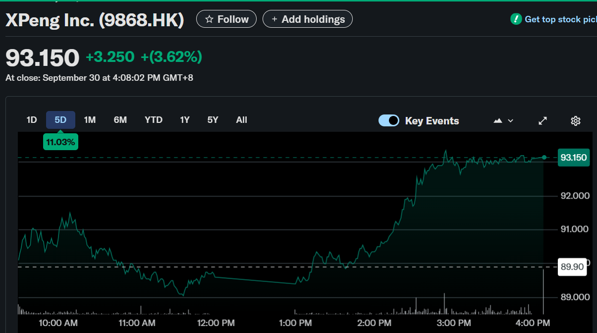 XPeng(9868.HK) stock closed higher at 93.15 HKD, climbing 3.62% as strong afternoon momentum carried into the close. The stock broke past resistance near 92 HKD and held gains, reflecting market confidence in XPeng’s quarterly performance. XPeng Inc. maintained upward traction as record deliveries supported a clear bullish sentiment in trading activity.