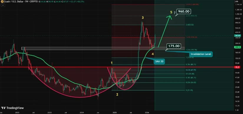 ZEC successfully broke free from a descending channel that had developed since late 2025, advancing from approximately $245 at the breakout point to roughly $370 within a matter of days.