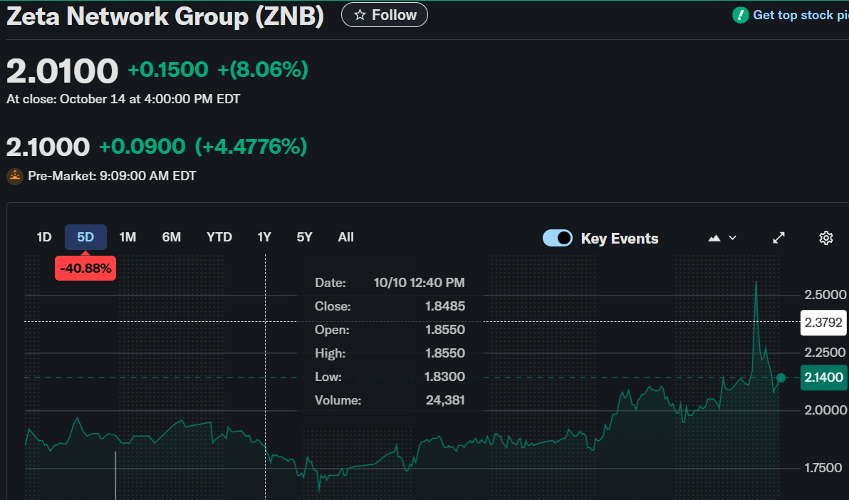 ZNB stock surged after confirming a $230 million Bitcoin-backed private placement to enhance liquidity. The ZNB stock closed at $2.01, rising 8.06%, and gained further in pre-market trading. The agreement reflects strong market confidence as the company executes its strategy to reinforce financial stability through digital asset integration.